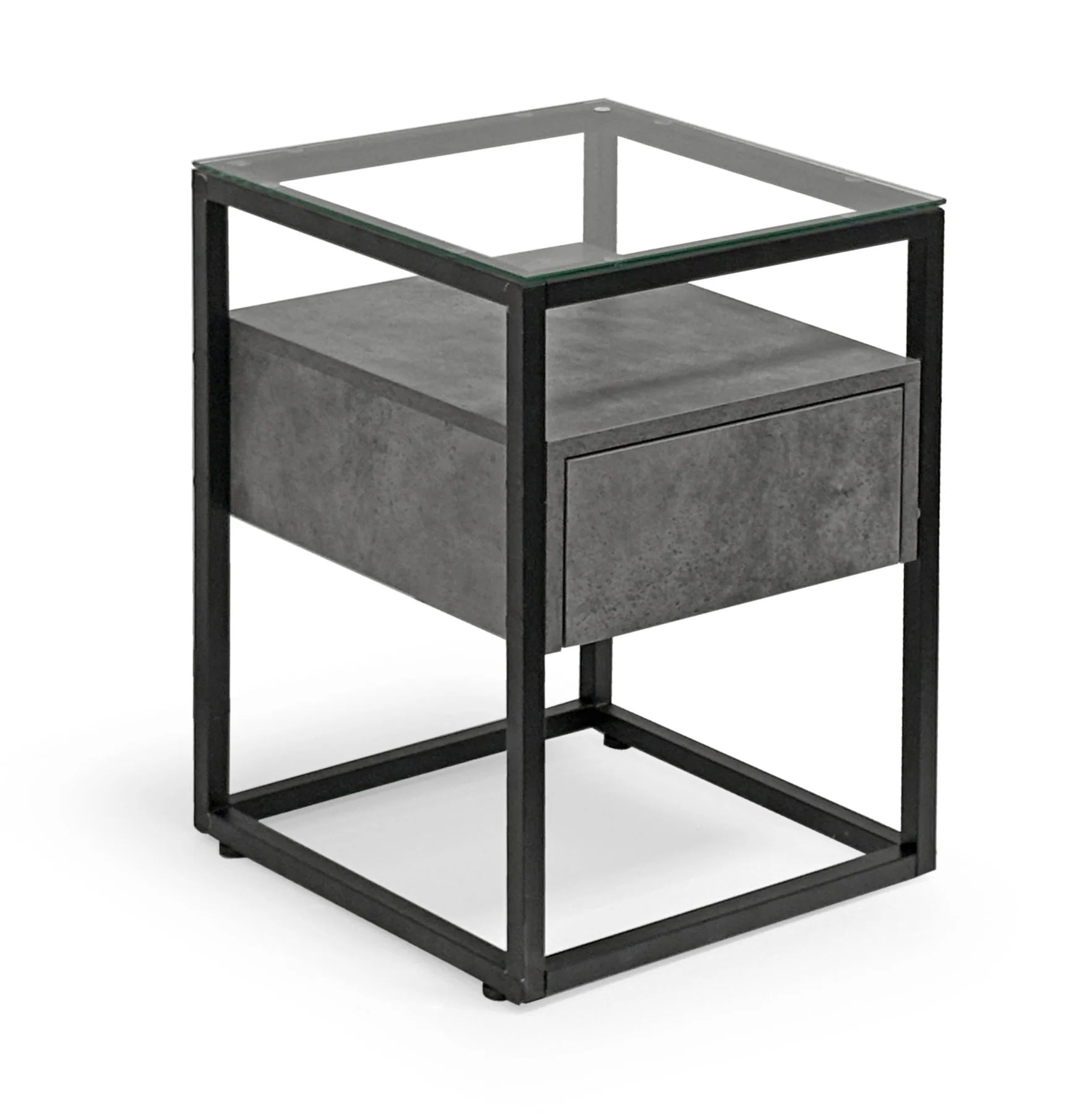 his square side table is sure to liven up your space. It features four black legs and a grey square cupboard with glass top.
